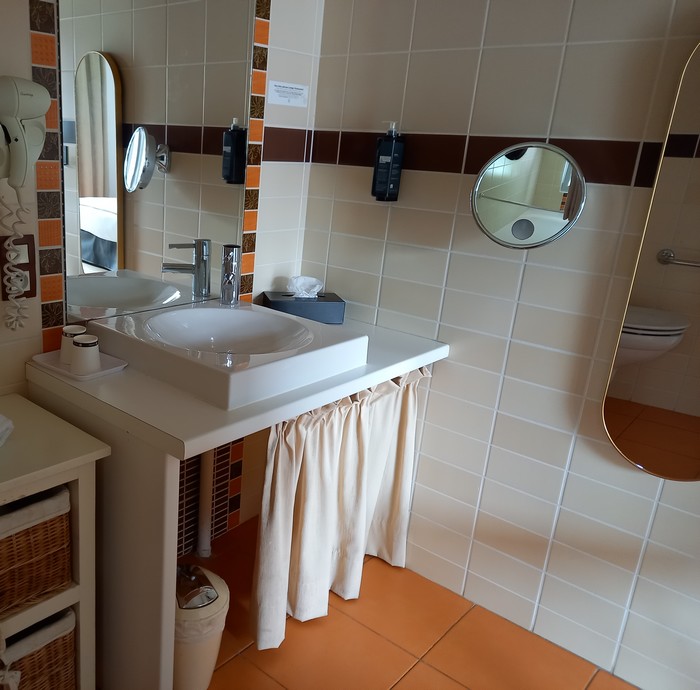 La chambre et la salle d'eau sont entièrement accessibles avec douche à l'italienne et lavabo évidé. Télévision avec télétexte. Téléphone à grosses touches et voyant lumineux. Wifi sur site.