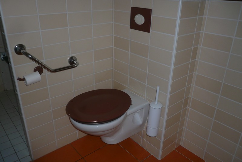 Comptoir d'accueil évidé et équipé d'une boucle magnétique. En rdc salle des petits déjeuners, sanitaires collectifs adaptés avec barre de transfert et lavabo accessible.